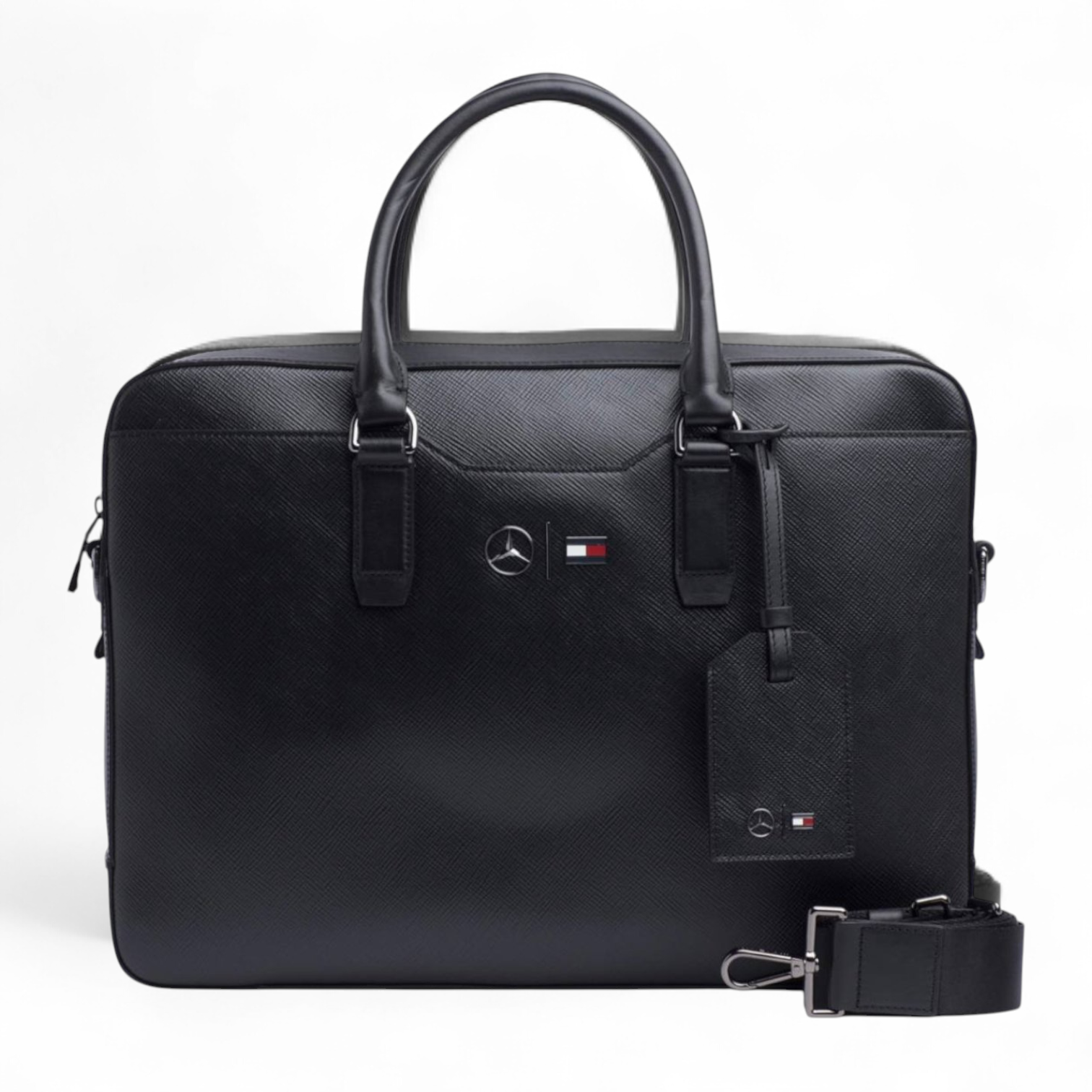 شنطه يد سوداء من تومي بجلد محبّب، سحاب معدني ممتد، يدان علويتان وحزام كتف قابل للفصل، بطانة كحلية وجيوب منظمة مع حجرة مبطنة للابتوب وشعارات معدنية راقية.