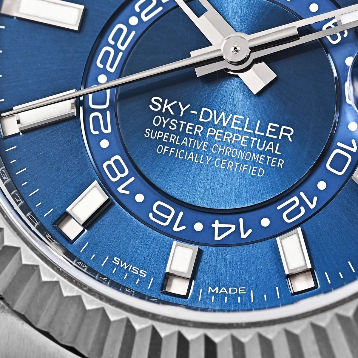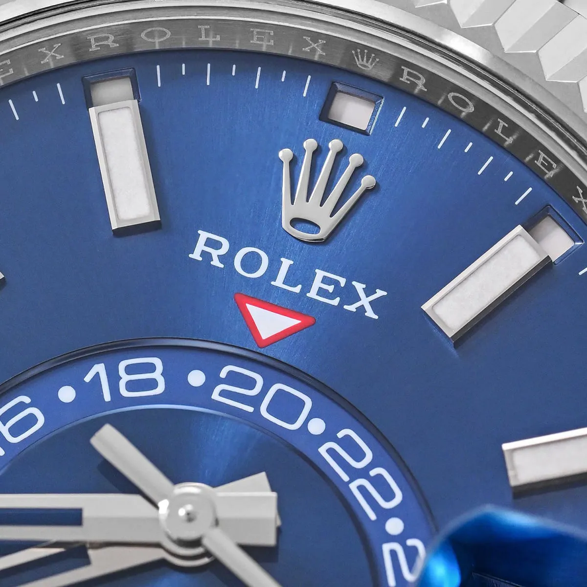 تتميز ساعة رولكس سكاي دويللر ميرور أوريجنال أيضاً بوجود نافذة تاريخ واضحة عند الرقم ثلاثة، وقرص توقيت 24 ساعة بتصميم داخلي جذاب يضيف لمسة تقنية متطورة على المظهر الكلاسيكي. تتكامل هذه الخصائص العملية مع تقنيات ضبط سهلة تضمن لك دقة متناهية دون تعقيد. ويأتي العرض السنوي والشهر في نوافذ صغيرة أعلى كل مؤشر ساعة ليمنحك نظرة شاملة وواضحة على التقويم دون الحاجة لجهد.