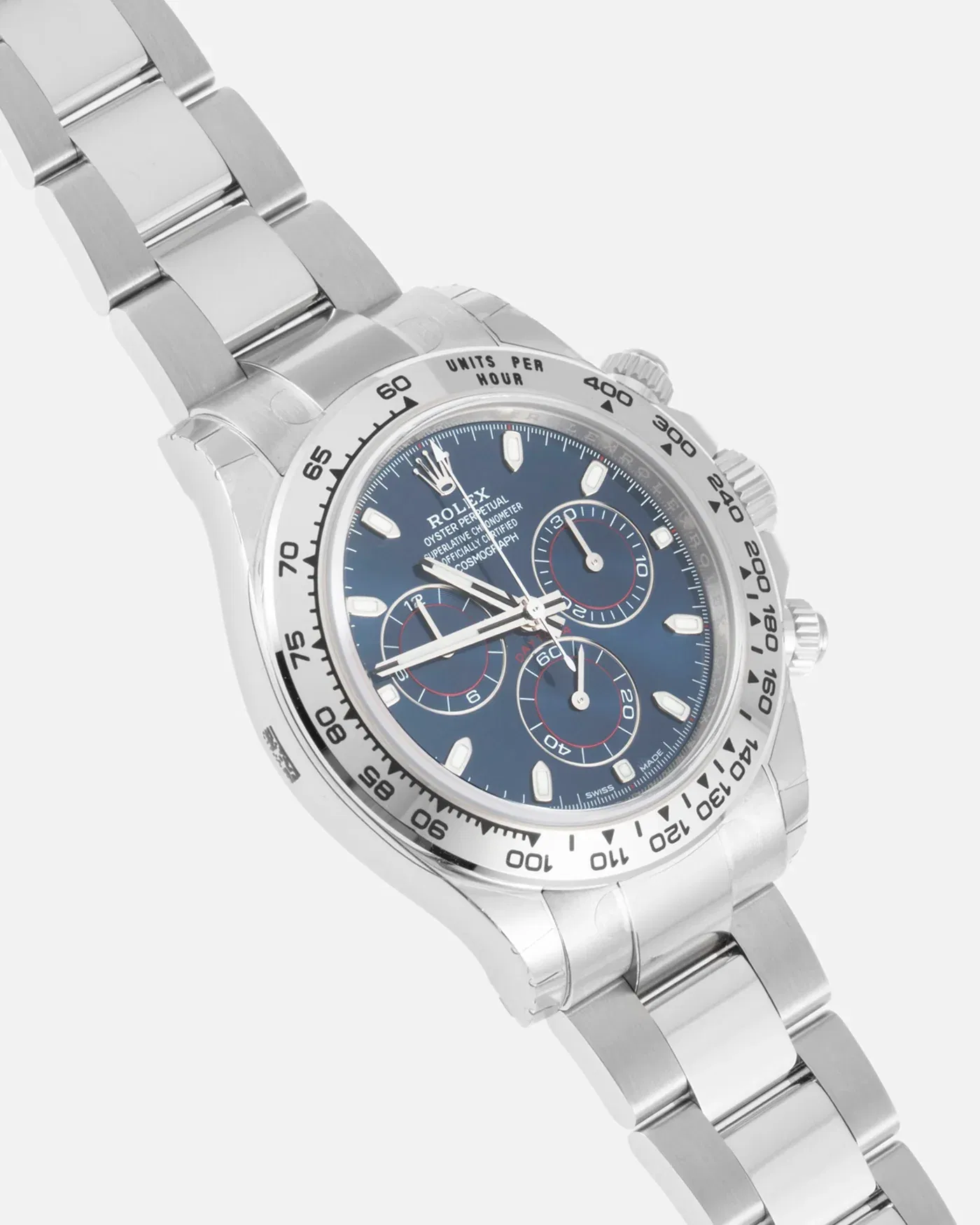 ساعة رولكس دايتونا، كما تُعرف هذه التحفة، تتميز بحركة كرونوغراف متقدمة تجعلها رفيقًا مثاليًا للرجال الذين يقدرون الدقة في كل لحظة. في الصورة، يظهر التصميم بشكل متناسق، حيث يتناغم اللون الأزرق الداكن مع اللمعان الفضي، مما يعطي انطباعًا بالقوة والأناقة. هذه الساعة ليست مجرد أداة لقياس الوقت، بل هي تعبير عن الذوق الرفيع الراقي ، مع تفاصيل دقيقة مثل العلامة التجارية “rolex” المحفورة بوضوح أعلى المينا، وزر التشغيل الجانبي الذي يعزز من الوظائف الرياضية.