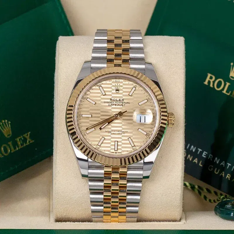 تتميز الساعة بوضوح مؤشراتها الفضية التي تنعكس على الخلفية الذهبية بشكل رائع، ما يتيح لك قراءة الوقت بسهولة ووضوح في مختلف الإضاءات. نافذة التاريخ الكبيرة عند الرقم ثلاثة تضيف لمسة من العملية لتعكس هوية رولكس التقليدية التي تجمع بين الرقي والوظيفة.