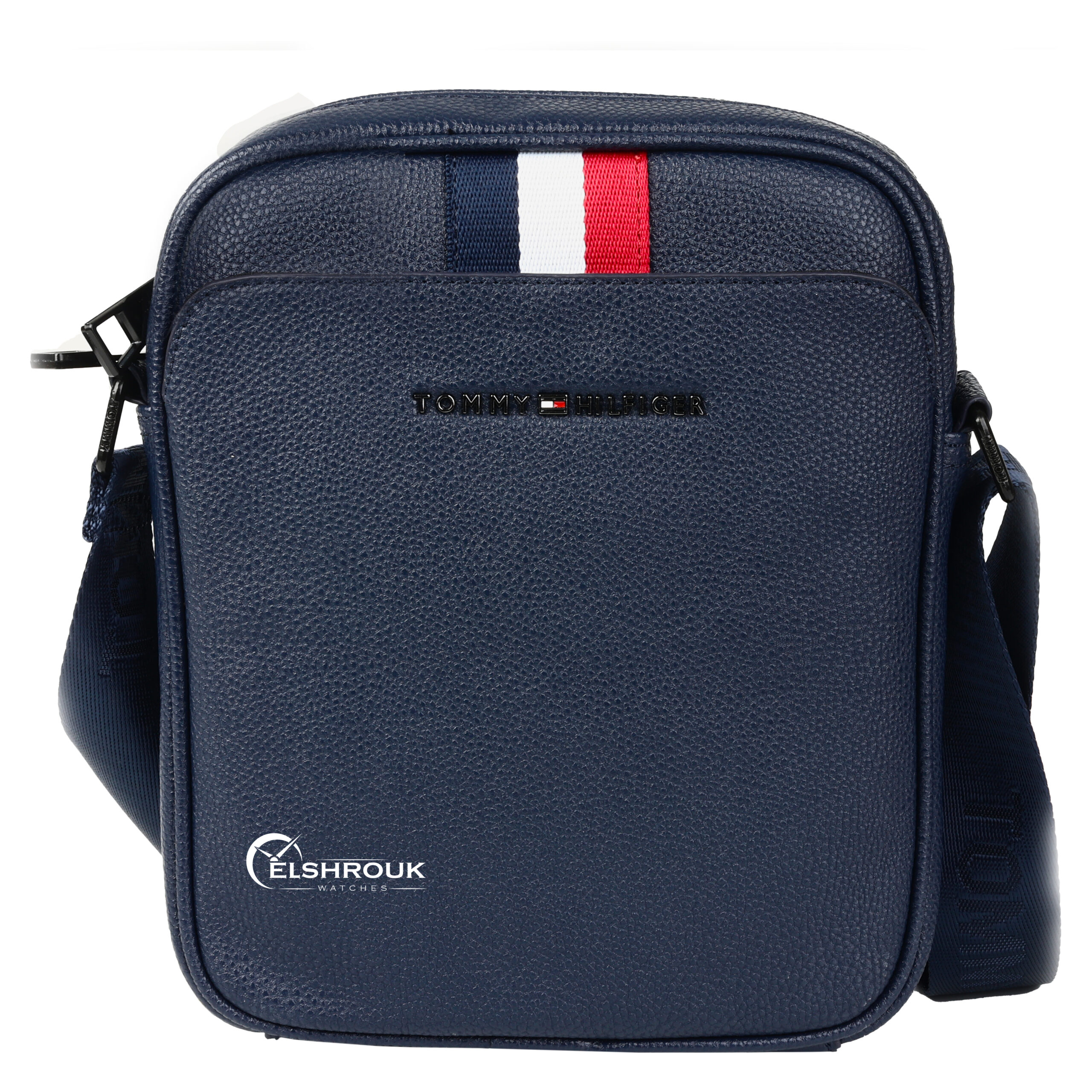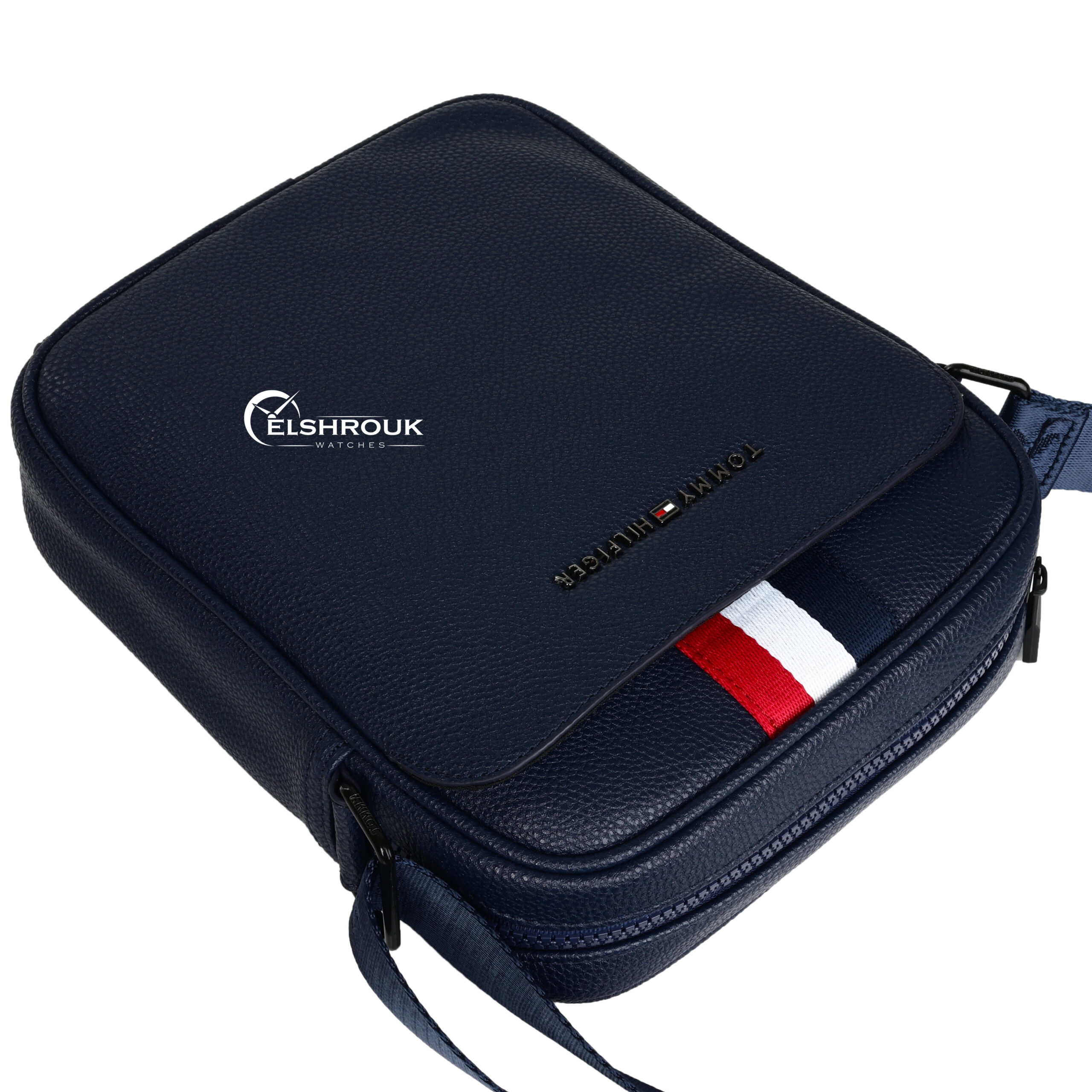 شنطة كروس تومي هيلفيغير رجالي أنيقة وعملية بلون كحلي وشريط أيقوني، سحاب متين وجيب داخلي، حزام قابل للتعديل، مثالية للهاتف والمحفظة وإطلالاتك اليومية.