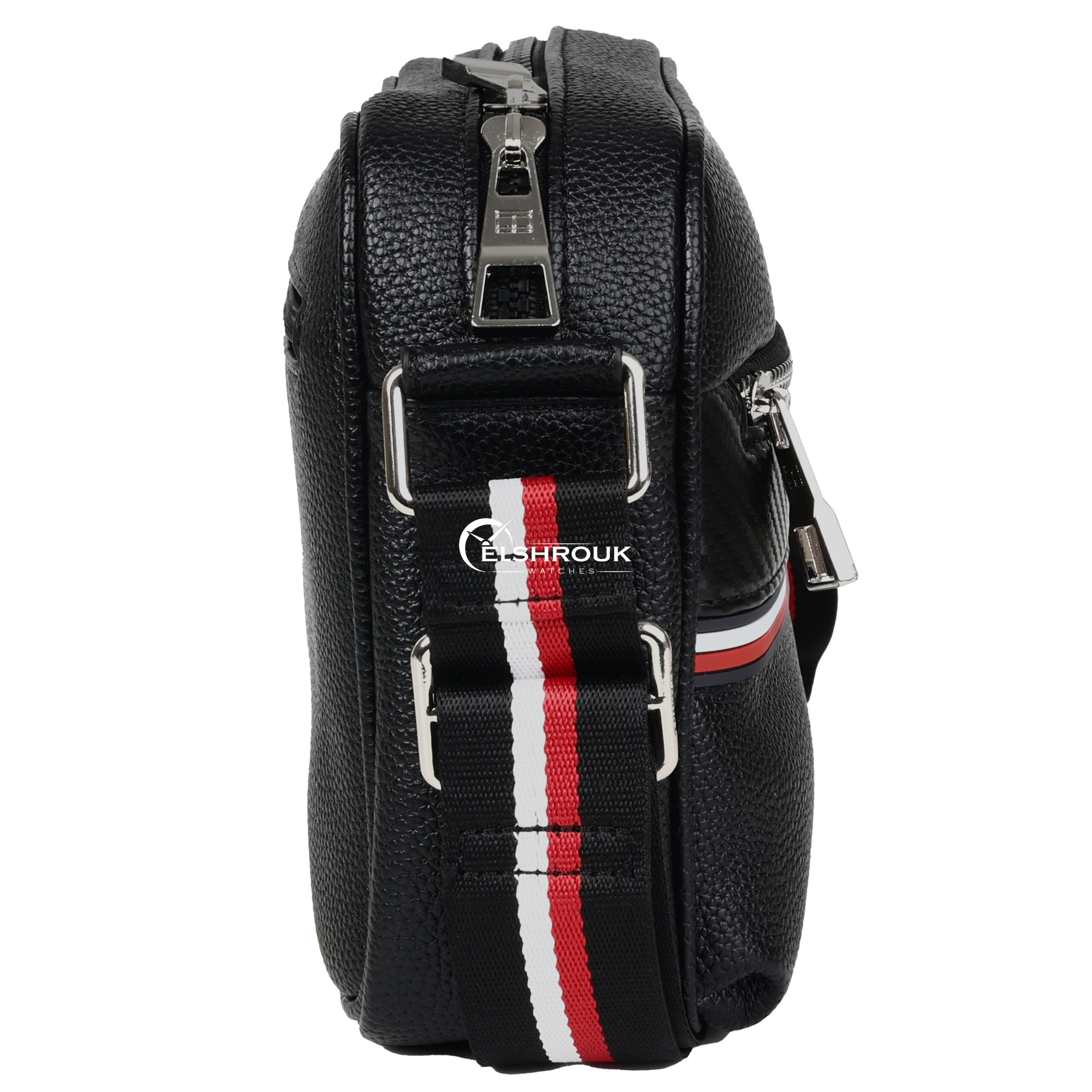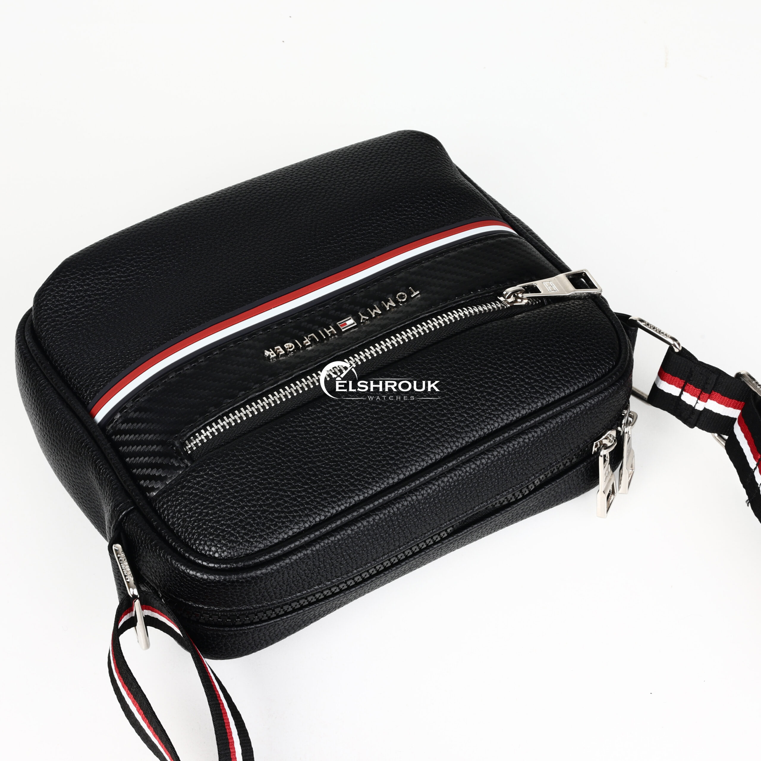 شنطة كروس ووتر بروف ماركة تومي هيلفيغر أنيقة بجلد محبب، شعار معدني، شريط ألوان مميز، حزام قابل للتعديل وجيب داخلي بسحاب؛ عملية وأنيقة لكل خروجاتك.