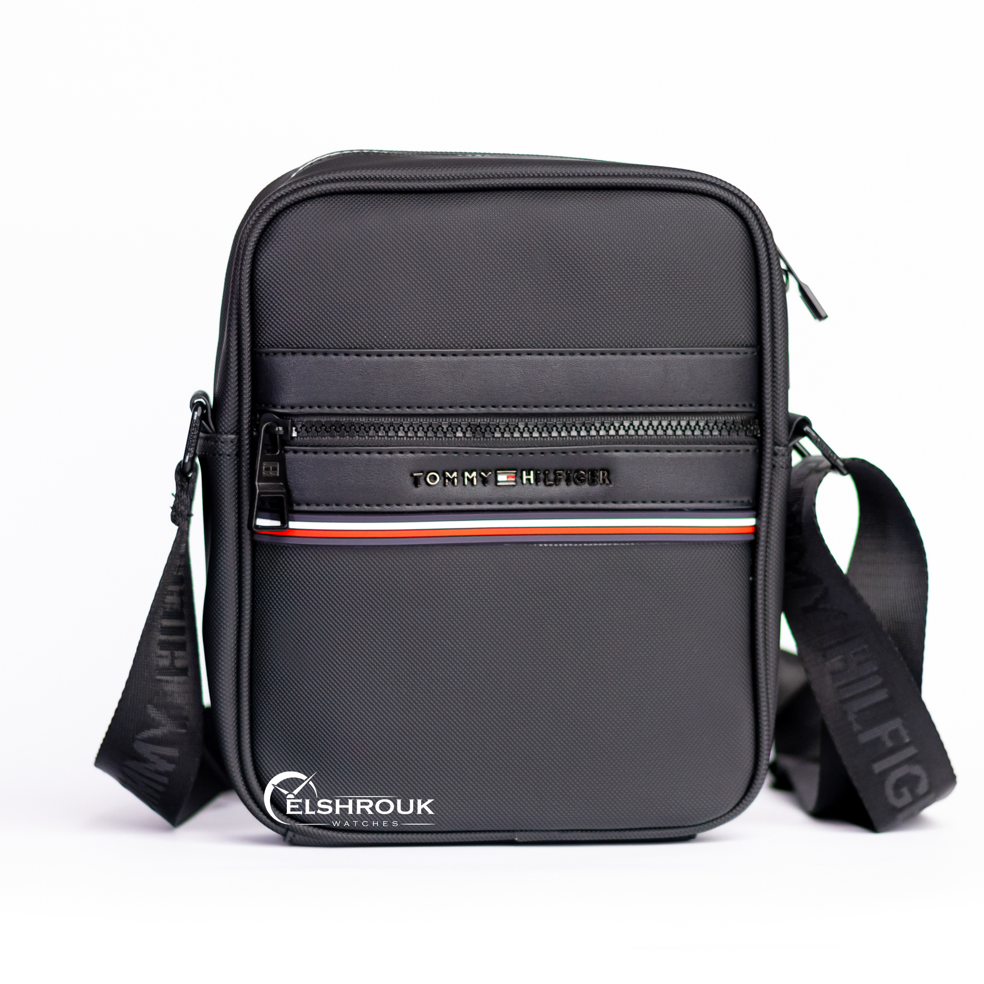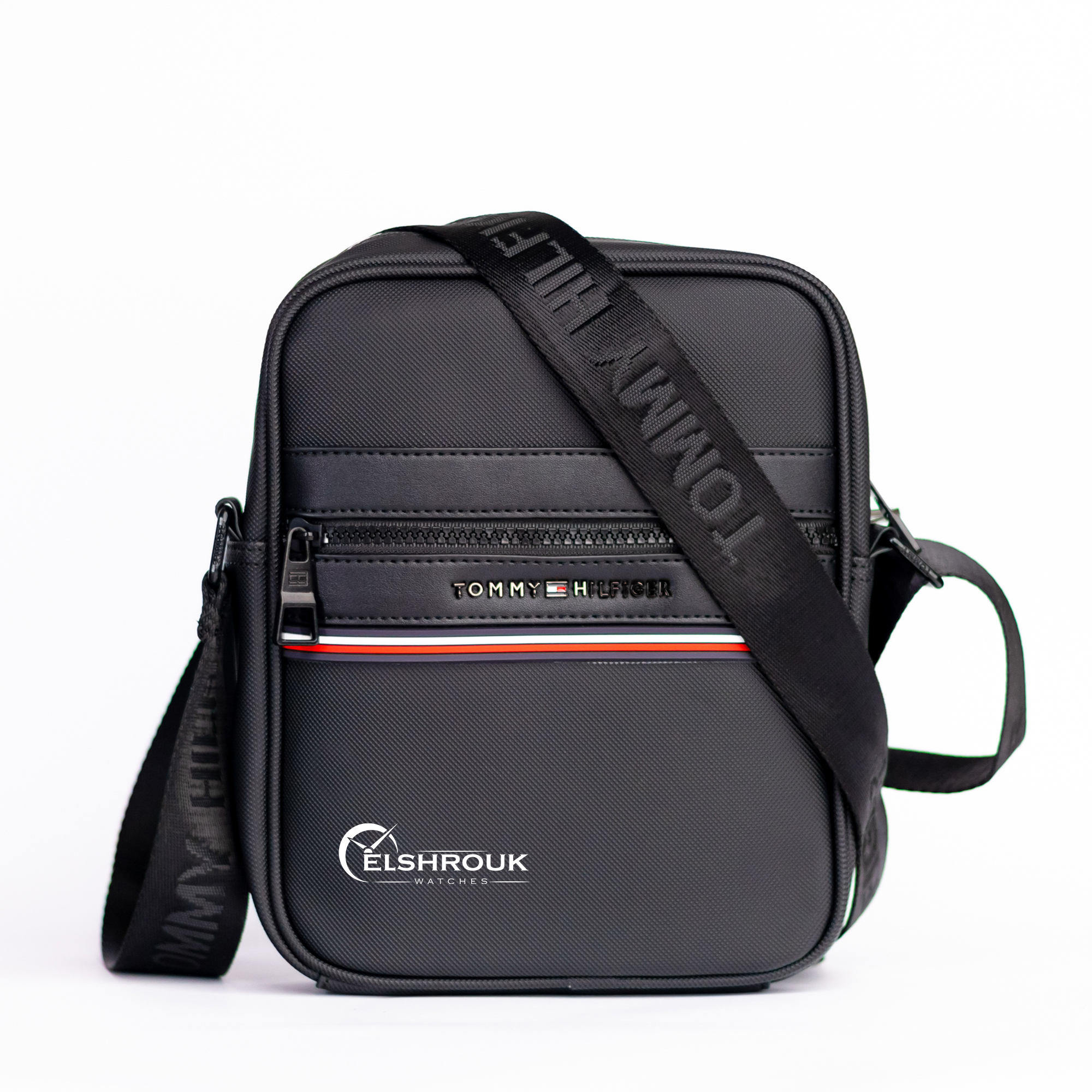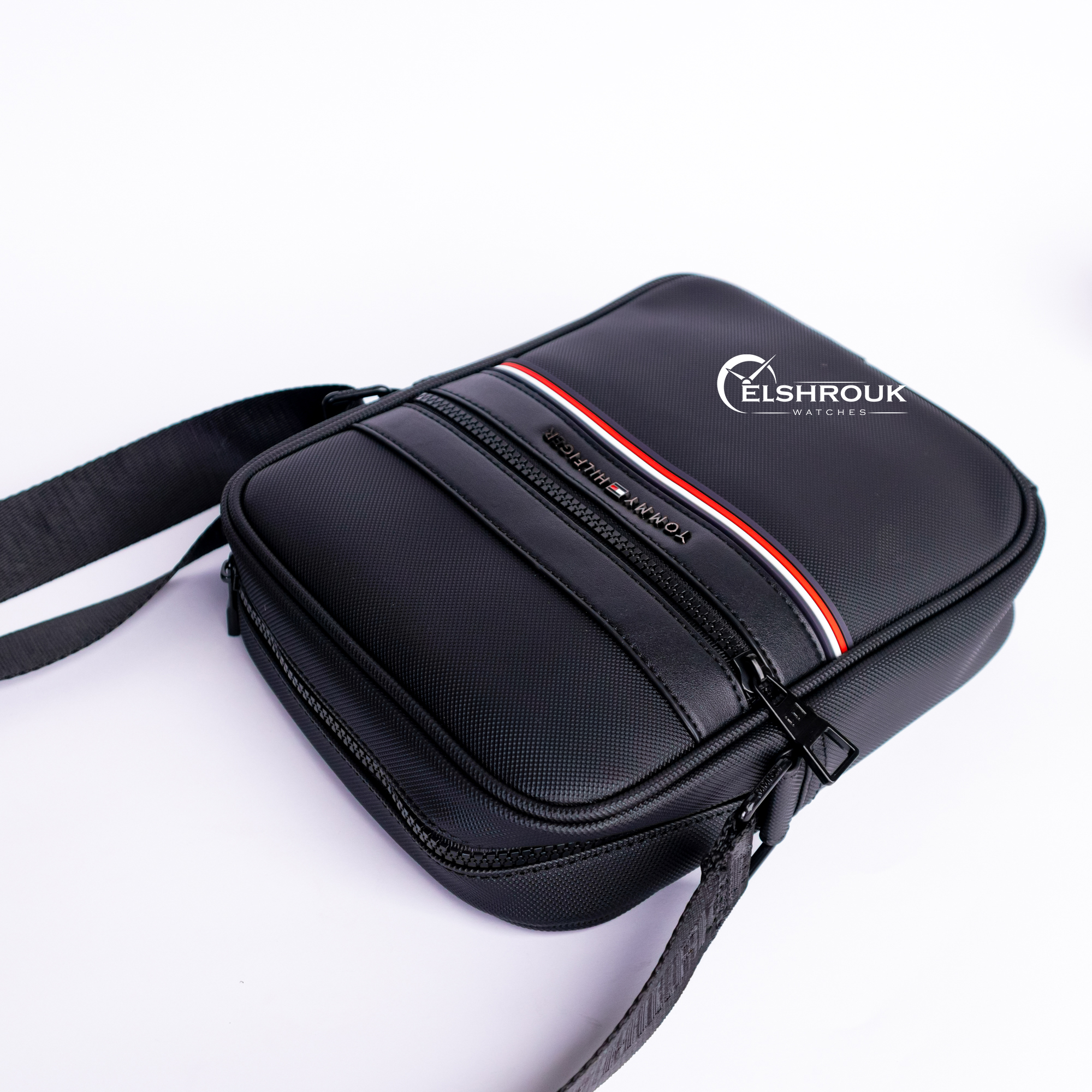 حقيبة كتف رجالية أنيقة بتوقيع Tommy Hilfiger تجمع بين العملية والفخامة في تصميم واحد مدمج. تأتي باللون الرمادي الداكن ذو ملمس حبيبي يمنحها قوة تحمل ومقاومة للخدش، مع خطوط نظيفة وزوايا مستديرة تعكس روح العصرية. الواجهة الأمامية تتزين بشريط ثلاثي الألوان الأحمر والأبيض والرمادي الفاتح يمر أفقياً ليمنح الحقيبة لمسة رياضية راقية، تعلوه علامة TOMMY HILFIGER المعدنية الدقيقة التي تبرز جودة التفاصيل. سحاب الجيب الأمامي أسود لامع مع سحّابة معدنية منقوشة بحرفي TH تضيف إحساساً بالمتانة والترف في آن واحد.