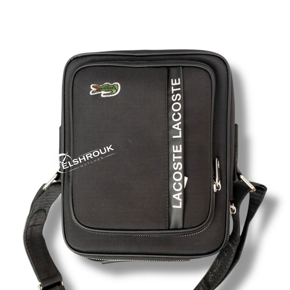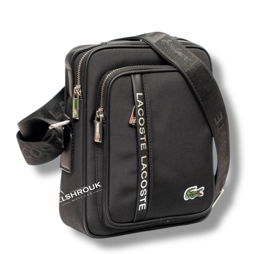 شنطة كروس لاكوست أنيقة باللون الأسود بنقشة مربعات، سحّابات معدنية لامعة، حزام عريض قابل للتعديل وجيوب متعددة لتنظيم يومي عملي وفاخر.