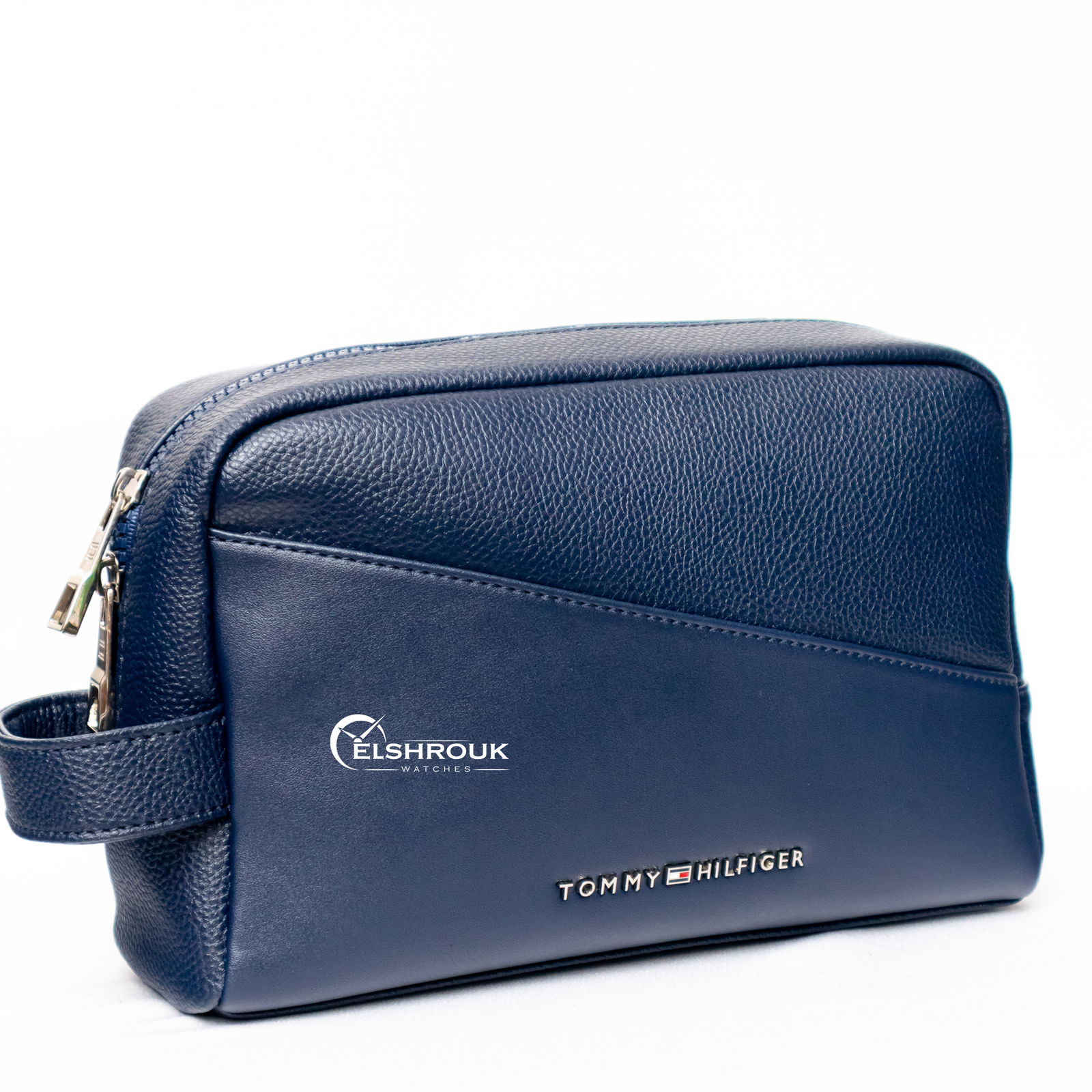 شنطه يد سوداء من تومي بجلد محبّب، سحاب معدني ممتد، يدان علويتان وحزام كتف قابل للفصل، بطانة كحلية وجيوب منظمة مع حجرة مبطنة للابتوب وشعارات معدنية راقية.