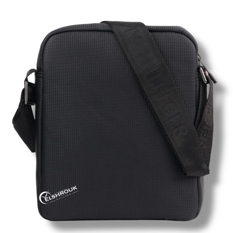 المساحة الداخلية مُقسّمة بذكاء: حجرتان رئيسيتان لتوزيع المحتويات اليومية مثل المحفظة والهاتف والمفاتيح وجهاز لوحي صغير، وجيب أمامي بسحاب يتيح الوصول السريع لما تحتاجه فوراً، إلى جانب جيب خلفي بسحاب لخصوصية أكبر. الحزام القماشي العريض قابل للتعديل، ثابت ومريح على الكتف، وتُزيّنه كتابة بارزة تمنح الحقيبة شخصية قوية، بينما تظهر لمسات الأحمر والأبيض والأزرق على جانب التثبيت لتضيف توقيعاً لونيّاً يعكس روح العلامة ويكسر رتابة اللون الأسود بلمسة راقية.