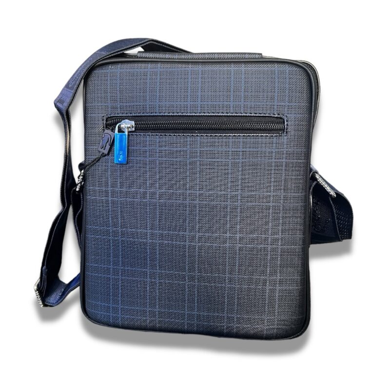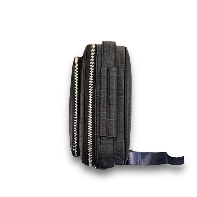شنطة كروس لاكوست رجالي ازرق بتصميم مربعات أنيق، حزام قابل للتعديل، سحّابات معدنية متعددة الجيوب لتنظيم مثالي، متينة وخفيفة تناسب العمل والمشاوير اليومية