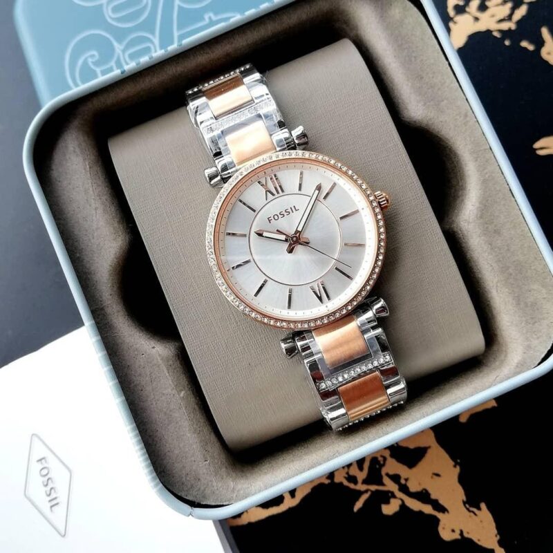 ساعة فوسيل للنساء اصلية موديل (كارلي) Carlie Two-tone ES4342 بلون فضي واستيك معدن بلون فضي ونحاسي
