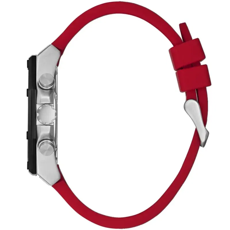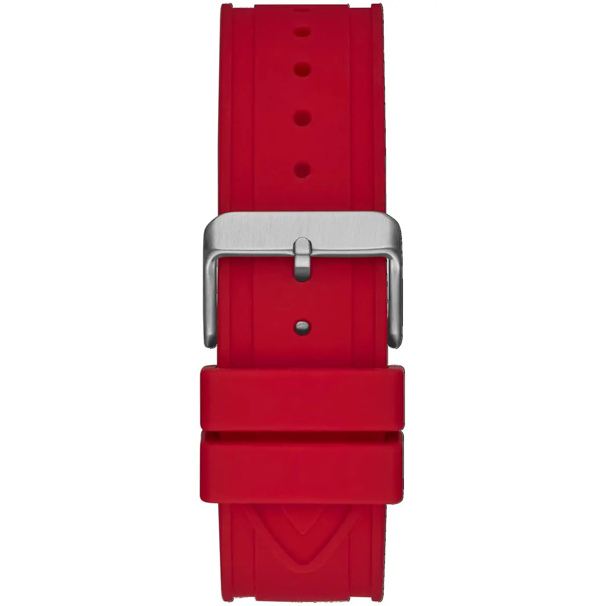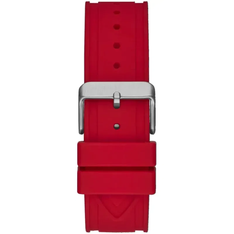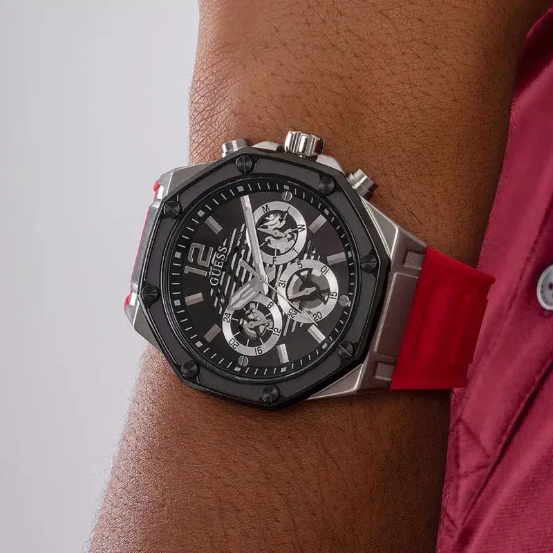 - تصميم فاخر وجريء: تتميز الساعة بشكل دائري أنيق يعكس قوة وجاذبية تصميمها العصري، كما أن اللون الأسود الأنيق للمينا يضفي لمسة من الغموض والرقي، بينما يبرز السير الأحمر الجريء شخصيتك المتميزة، مع شعار “Guess” المحفور بتفاصيل دقيقة ليبرز الهوية الراقية للعلامة التجارية.